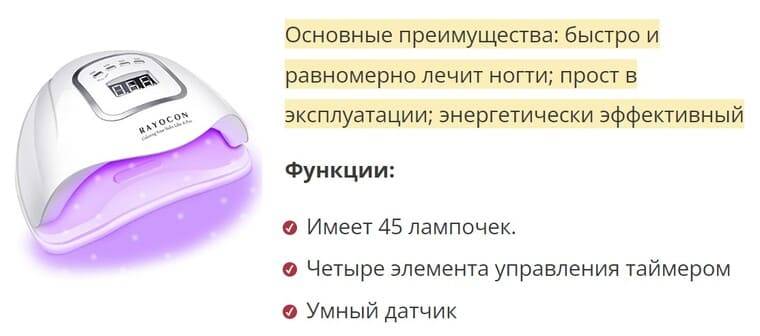 Наличие автоматического счетчика времени (регулятора). Удобное приспособление позволяет не волноваться о том, сколько подсушивается слой геля. Вручную засекать время при наличии счетчика нет необходимости.