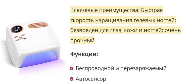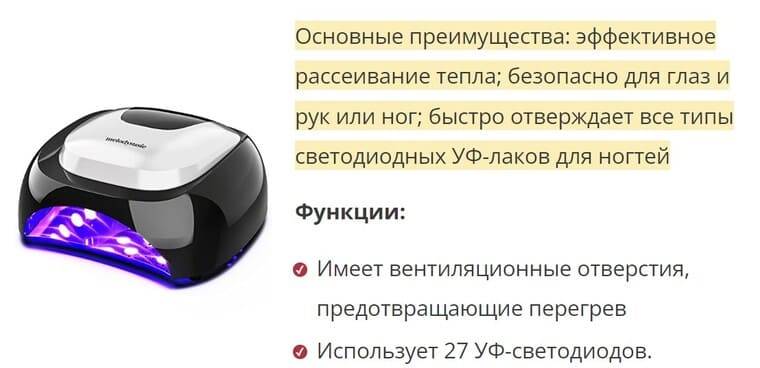 Основные преимущества: эффективное рассеивание тепла; безопасно для глаз и рук или ног; быстро отвержает все типы светодиодных УФ-лаков для ногтей. Имеет вентиляционные отверстия, предотвращающие перегрев инструмента.