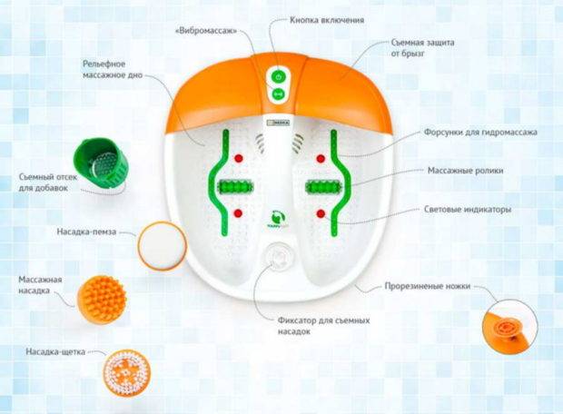 Массаж ног создается благодаря непрекращающейся вибрации корпуса ванночки, а также с помощью специальных роликов-насадок и вырывающимся струям воды из отверстий на дне корпуса.