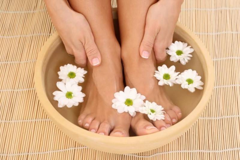 - Цветочная ванночка. Помогает при трещинах и сухой коже стоп. Подготовьте по 1 столовой ложке цветов ромашки и календулы, 3 столовых ложки лепестков роз и 2 литра вода. Воду вскипятите и всыпьте в нее смесь цветов. Оставьте отвар настаиваться на 15 минут. Перемешайте и процедите состав, чтобы опустить в него ноги на 10-15 минут. После этого можете вынуть ножки, чтобы потереть их пемзой или скрабом и снова опустить в ванночку на 15 минут.