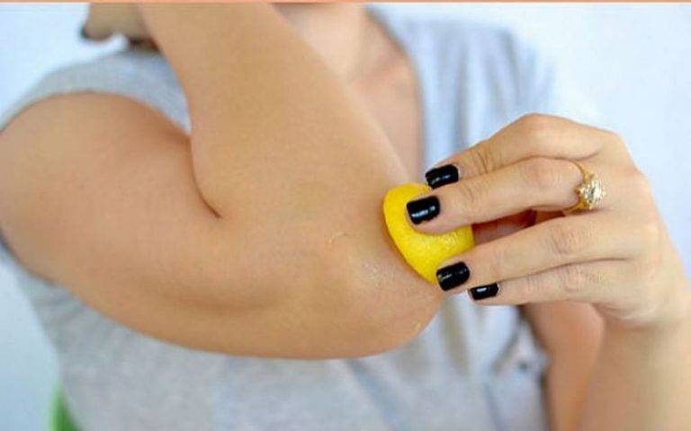 - хорошо очищает кожу кислота, для этого можно либо просто разрезать цитрусовый (грейпфрут или лимон) пополам, немного помять мякоть и установить в получившиеся «чашки» локти, либо заранее выдавить сок лимона и нанести его на огрубевшее место ватным диском, а потом смыть, способ не подходит при появлении трещин.
