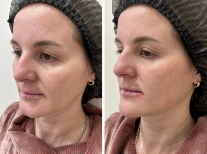 Так как у пациентки первая (начальная) степень птоза, для контуринга овала лица и профилактики образования губо-краевой борозды канюлей веерно подкожно был введен филлер Hyon Max 2,0 %. Направление введения – проекция нижнечелюстной связки. Также один веер проходил по краю нижней челюсти, сглаживая первые признаки предбрыльного втяжения.