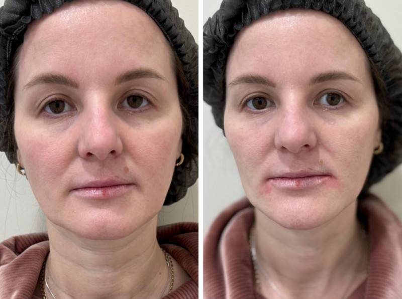 Оставшиеся 0,4 мл препарата были разделены по 0,2 мл и веерной техникой инъецированы иглой в область углов рта: это позволило сгладить градиент между нависающей частью щеки и сублабиарной областью.