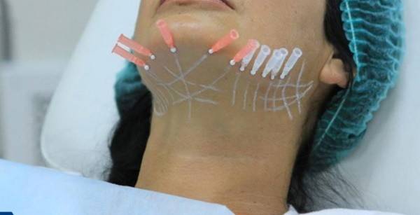- Лифтинг. Чтобы сформировавшийся каркас демонстрировал нужный эффект в течение продолжительного периода времени, требуется вводить велюровые ткани, состоящие из полидиоксанона. Это позволяет добиться подтяжки второго подбородка. Обеспечить крепкую фиксацию под кожным покровом возможно за счет велюровых нитей, обладающих стабильной структурой и разносторонними насечками.