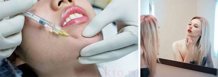 Достоинством этого метода безоперационной пластики является возможность быстро вернуть естественную форму подбородка, введя препарат, нейтрализующий действие филлера. Так вам не придется ждать месяцы, чтоб избавиться от непонравившейся формы или снова проводить коррекцию.