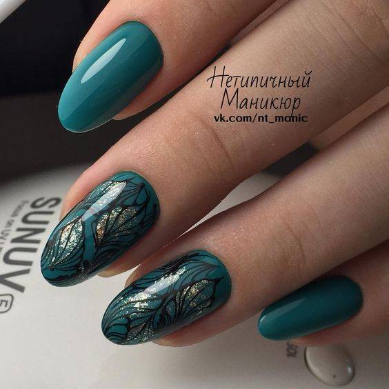 Дизайн просто создан для того, чтобы подчеркнуть изящность и утонченность миндалевидной формы ногтей. Чаще всего выполняется такой маникюр в виде однотонного покрытия, в котором один палец выделяется небольшим рисунком, линиями или надписью. Также сейчас активно набирает популярность минималистичный дизайн, в котором акцент выполнен по технике negative space. В данном случае это может быть, как небольшой участок в виде точки или линии, так и полноценный прозрачный рисунок на цветной основе.