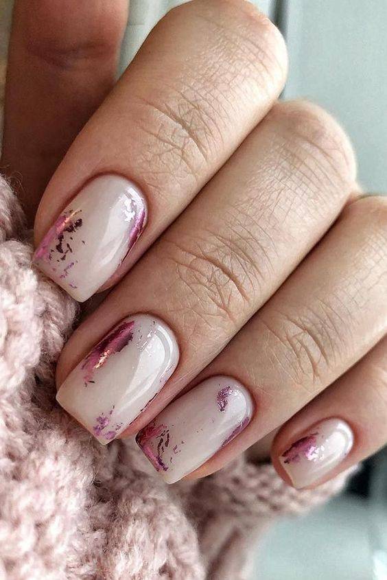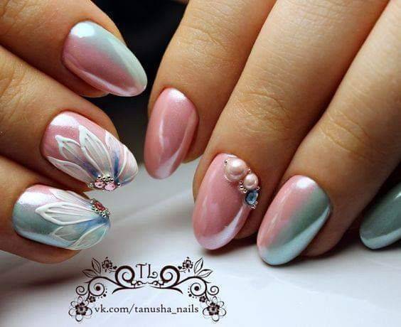 Модный в нынешнем сезоне дизайн, который буквально “взорвал” нейл-арт индустрию. Декоративная втирка имитирующая жемчужную или же металлизированную поверхность — это просто идеальный вариант для оформления как повседневного, так и вечернего маникюра. В первом случае следует выделять один-два ноготка в сочетании с нюдовой основой, а во втором уже можно смело экспериментировать с яркими покрытиями и декорировать всю руку.