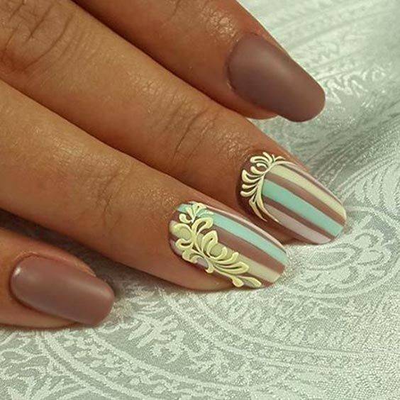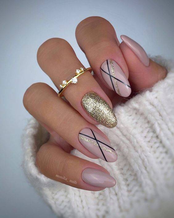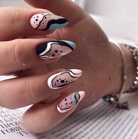 Треугольники, ромбики, полоски, зигзаги и т.д. не только подчеркнут элегантность миндальной формы, но и при этом станут еще необычным декором в оформлении маникюра. Украшать таким образом лучше один-два ноготка или же полностью всю руку.