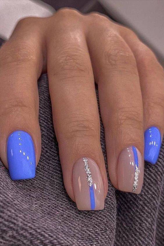 - Разноцветным глиттером, нанесенным поверх прозрачного геля, оформите свободный край. Для того чтобы сделать дизайн максимально похожим на аквариум, придайте ноготкам синеватый оттенок с помощью голубого геля. Закрепите покрытие в лампе.