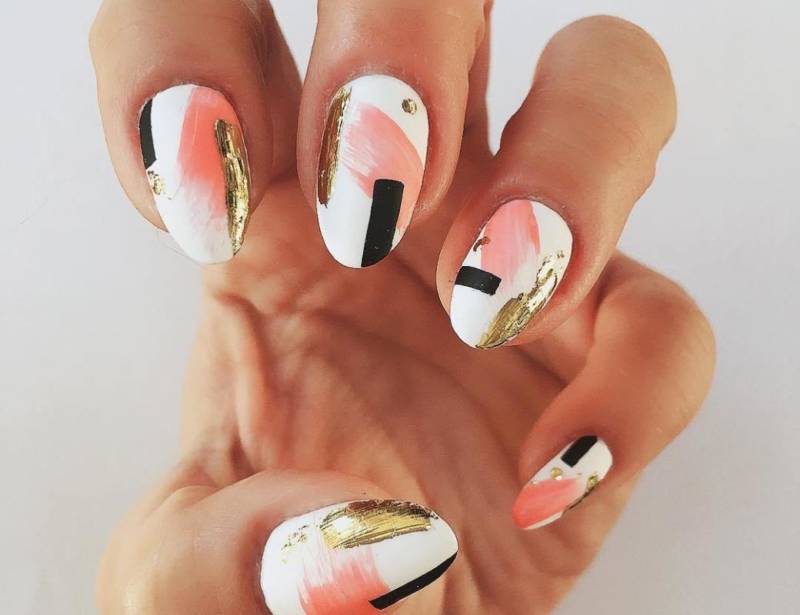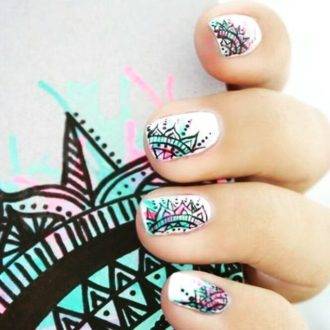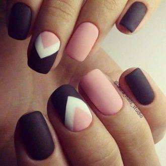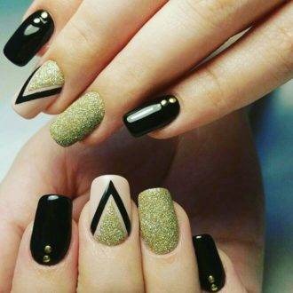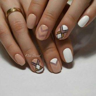 Использование изображений геометрических фигур будут не менее модными нежели в этом. Зигзаги, точки, треугольники, квадраты будут сочетаться на ногтях по одной из особенностей – величине, форме, цвету. Для ноготков разной длинны прекрасно подходят геометрические узоры. Также, многие стилисты рекомендуют объединять модные полоски геометрическими узорами, зонируя ногтевую пластину на части, где в каждой располагается своя фигура. Большим плюсом этого нейл-дизайна есть зрительная коррекция природной формы «родных» ногтей – которые визуально выглядят длиннее и уже.