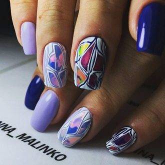 Этот вид рисования трудоемкий, но при наличии опыта он становится удобным. Все, что вам понадобится – бесцветный лак, два вида цветного лака и скотч. Наперед из скотча вырезают необходимый трафарет, с помощью которого вы создадите оригинальные рисунки. После нанесения основного цвета надо дождаться, чтобы он высох. Затем наклеить подготовленный скотч и нанести второй цвет.