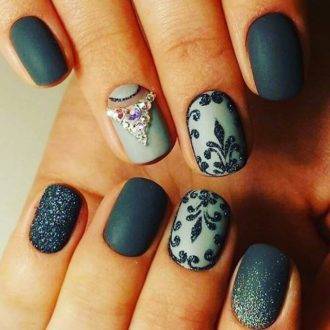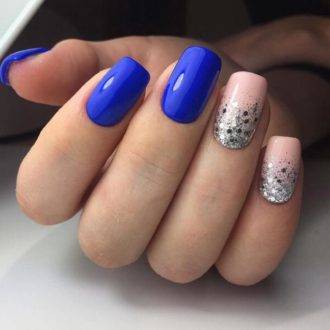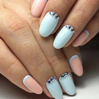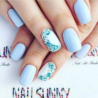 Тенденции маникюра отдают предпочтение ярким акцентам. Маникюр в любой цветовой гамме может быть разбавлен сразу двумя акцентами — стразами и блестками