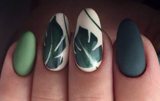 Модный летний матовый маникюр в оливковом оттенке с рисунком.