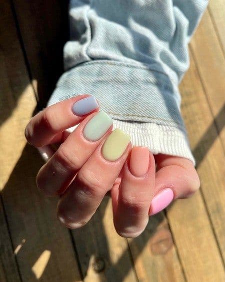 Пастельные тона тоже остаются с нами летом. Они идеально сочетаются с загорелой кожей. Это пастельно розовый, синий, желтый, персиковый, мятно-зеленый или сиреневый.