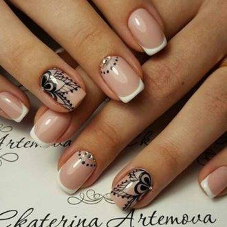 Для того чтобы красиво оформить ногти, в своем арсенале необходимо иметь кисточки. Неплохо, когда кисточка от лака удобная и тоненькая. В противном случае можно заменить ее обычными кисточками различными о толщине и форме. Выигрышно смотрятся простые и симпатичные рисунки в сочетании с френчем. Если использовать лаки различных цветов, можно сделать «леопардовый» узор. Один из самых легких вариантов – ставить точки, различные по диаметру, потому что горошек моден всегда!