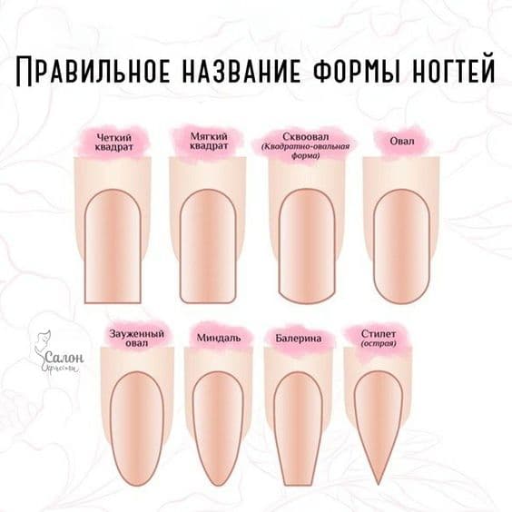 Несмотря на то, что мир маникюра и нейл-арта не стоит на месте и с каждым годом появляется все больше причудливых форм, названий и вариантов, основными формами ногтей принято считать 8 названий: четкий квадрат, мягкий квадрат, квадрат с мягкими краями, овал, зауженный овал, миндаль, балерина и стилет. Все они — на картинке ниже.