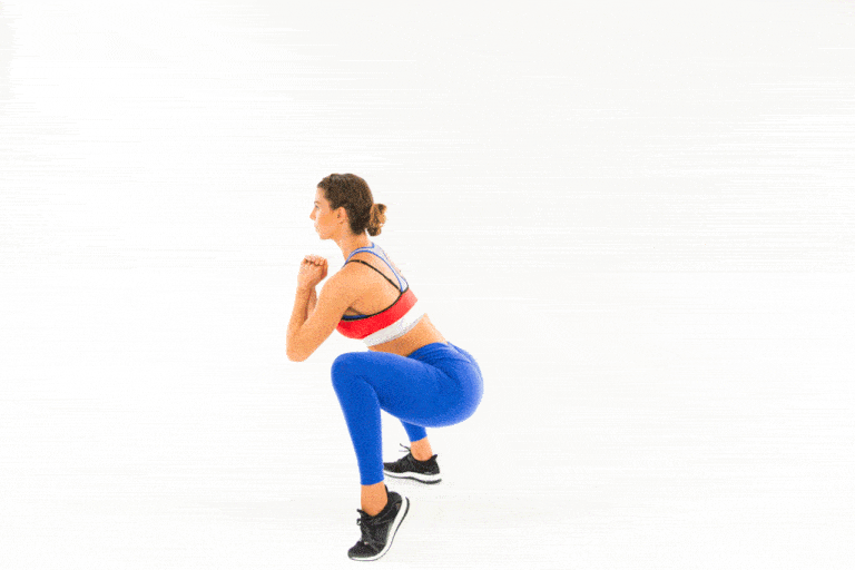 - Совершите присед до угла 90 градусов в коленных суставах.