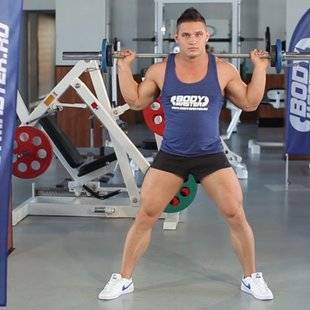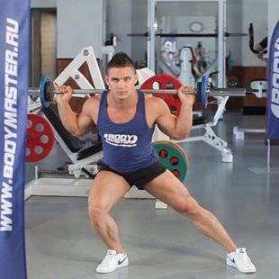 - Разместите штангу на плечах, стопы на ширине плеч, носки разверните на 45 градусов наружу;