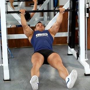 - Лягте на скамью лопатками. Пятки стоят под коленями. Разместите штангу внизу живота (на подвздошных костях);