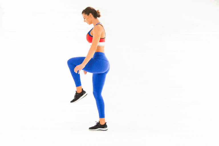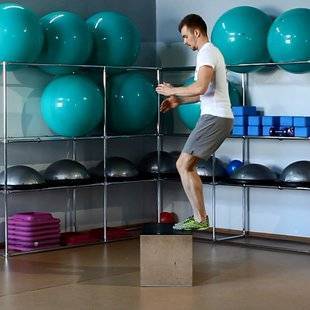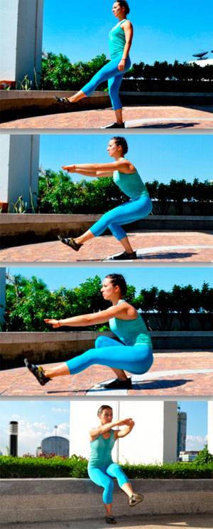 Упираясь пяткой в пол, мощным движением вытолкните себя опорной ногой вверх. Сохраняйте спину прямой, держите баланс с помощью рук.