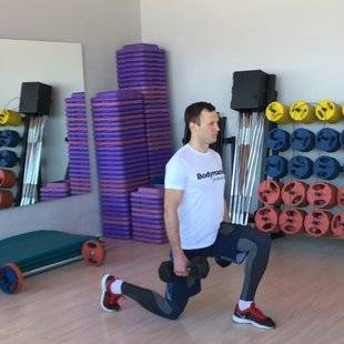 - Теперь делаем выпад одной ногой вперед и приседаем необходимое количество раз (5-10);