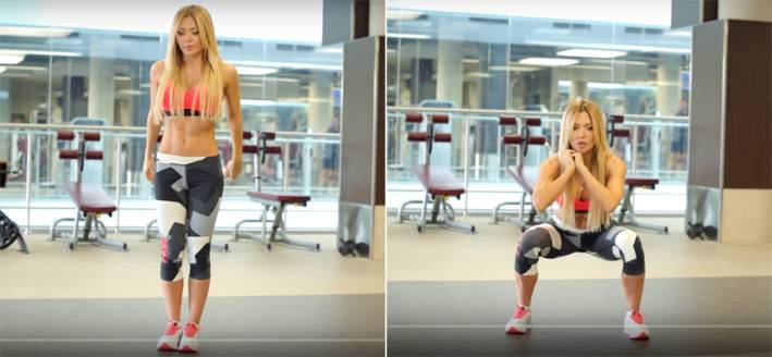 - Спину держим прямо и производим приседания (20-25 раз за один подход).