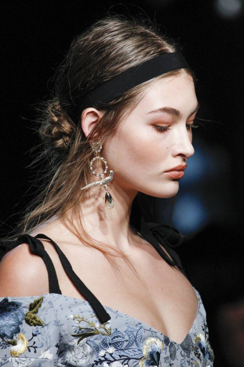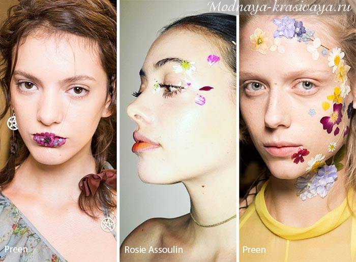 Цветы и растения украшают нашу жизнь – букеты, живые цветы, цветущие кусты делают жизнь радостной и разнообразной. Цветами украшают квартиру, платья, цветочные лепестки – прекрасный материал для творчества – аппликация, картины, панно. В видении модных дизайнеров и их визажистов, цветы вполне подходят и для украшения лица, создания романтических образов. Вал Гарланд для Preen и Джеймс Калиардос для Rosie Assoulin изобразили именно такой необычный, запоминающийся макияж. Тонкая линия цветов восходит по шее и достигает лба, высушенные фиолетовые, красные лепестки украшают виски. Preen кроме того насыпал бордовые блестки на губы, придерживаясь естественной линии рта.