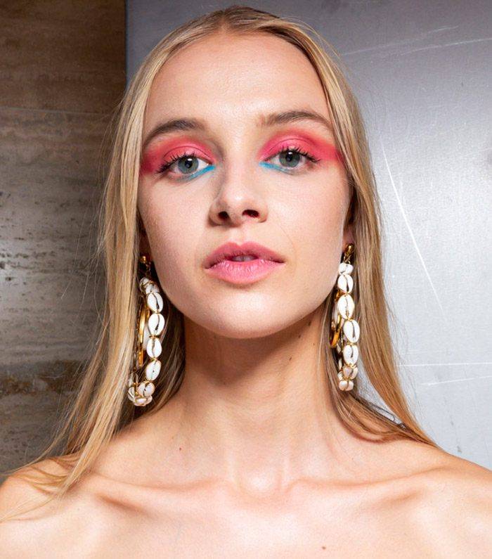 - Красный и розовый мейкап. Эти цвета стали «гвоздями» показов. Присутствие алого или сочно-розового оттенков одновременно на губах, щеках и глазах сродни эффекту разорвавшейся бомбы. Помады с жирной текстурой ярких тонов наносились традиционно на губы, тогда как тени и румяна имели совершенно непонятный рисунок без четких линий и сливались в одно пятно, растушеванное до висков.