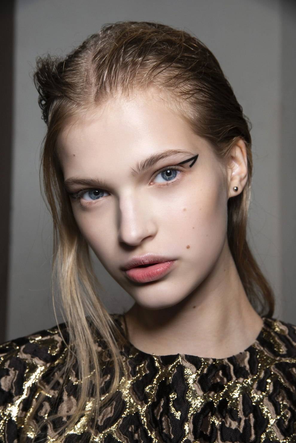 В тренде графическая четкость, футуристические мотивы, «сияющая кожа», которую создают с помощью хайлайтера, модный макияж «кошачий взгляд».