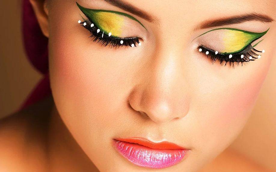 - Арт-макияж. Украшение лиц рисунками на темы абстракции и цветов — еще один модный бьюти-козырь. Нарисованные тенями рисунки дополняются наклейкой страз и элементами лепнины, что смотрится очень экстравагантно.