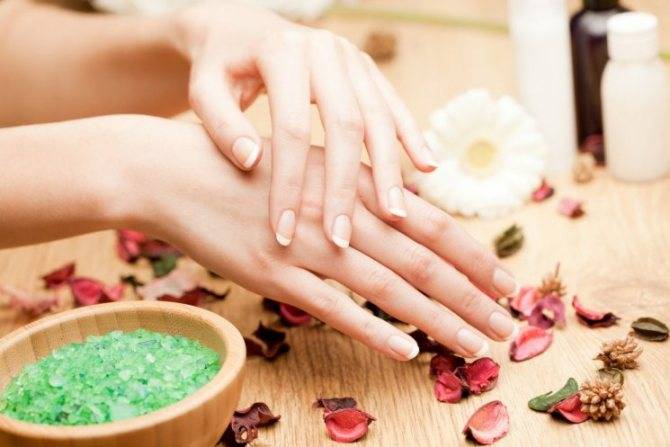 Два раза в неделю необходимо делать рукам теплые ванночки с добавлением укрепляющих масел, ромашки с морской солью. Достаточно подержать руки в растворе 15-20 минут.