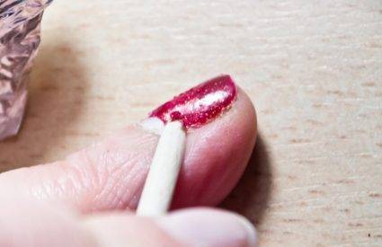 - Обработать ногти размягченными в жидкости для снятия лака спонжами, чтобы она быстро не высохла, пальцы со спонжами оборачивают фольгой.