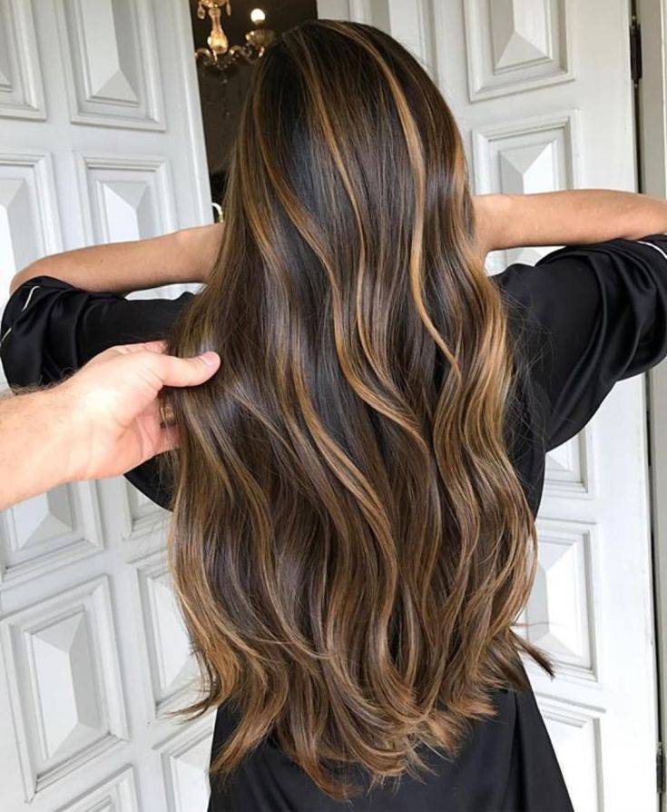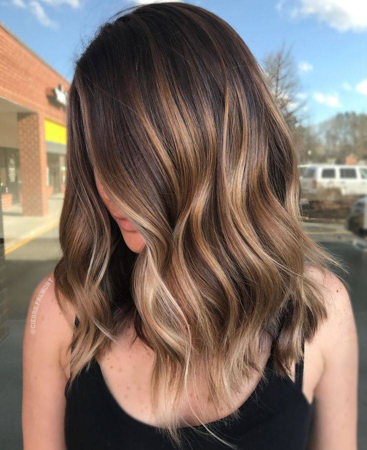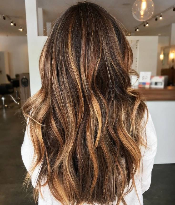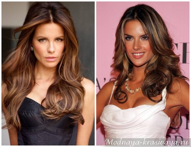 В этом виде окрашивания для темных волос используется метод «растяжки» кофейного, шоколадного, пшеничного и других цветов.