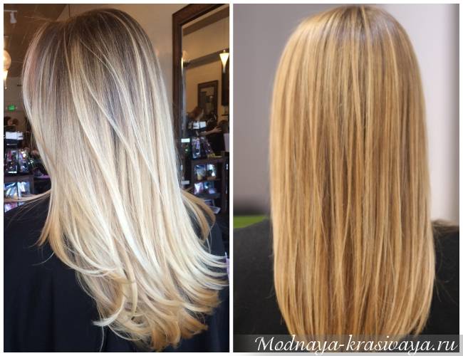 Во втором случае мастер использует больше тонов для осветления. Это делается с целью вытянуть цвет от темных корней к очень светлым кончикам. Чтобы переходы в цвете при такой контрастной смене оттенка не получились слишком броскими и не выглядели «дешево», стилисту приходится использовать разнообразную палитру оттенков – в районе 5 тонов.