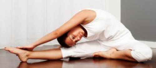 - Сядьте на коврик. Ноги должны быть прямыми и разведенными. Правую ногу согните в колене, левую отведите назад и слегка согните. Наклоните тело к левой ноге, пытаясь достать до нее обеими руками. Задержитесь на 20-30 секунд, вернитесь в исходную позицию и повторите наклоны. Упражнение нужно выполнять, поменяв ногу.