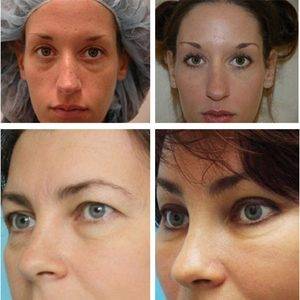 - кантопексия не устраняет выраженные эстетические дефекты, «гусиные лапки» и «мешки» под глазами, поэтому используется в комбинации с блефаропластикой.