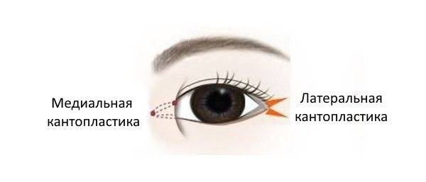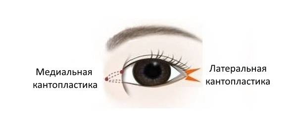 Кантопластика может быть латеральной или медиальной. В первом случае исправляют птоз внешнего, во втором — внутреннего уголка глаза.