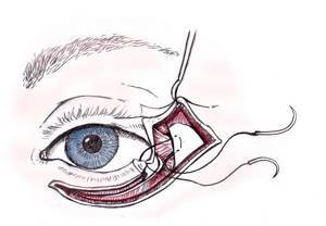 Далее, концы ушиваются и закрепляются к надкостнице в совокупности с латеральным фрагментом круговой мышцы. Если эта процедура совершается на внутреннем уголке глаза, ее именуют медиальной кантопластикой.