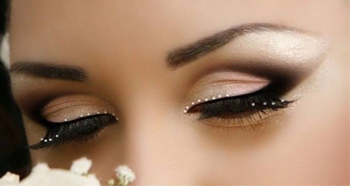 После растушевания стрелки она покрывается темными тенями, коричневыми или черными. Затем внутренняя сторона век покрывается тенями белого цвета. Последний этап — удлиняющая тушь на ресницы.