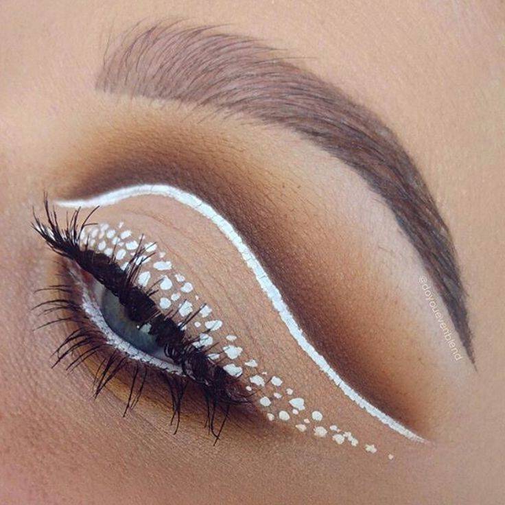 Если ты заинтересована в «кошачьем» взгляде, то выполняется техника макияжа карандашом, не соединяя линии стрелок сверху и снизу. Их тоже нужно слегка растушевать, подчеркнув зазор между ними белой капелькой теней.