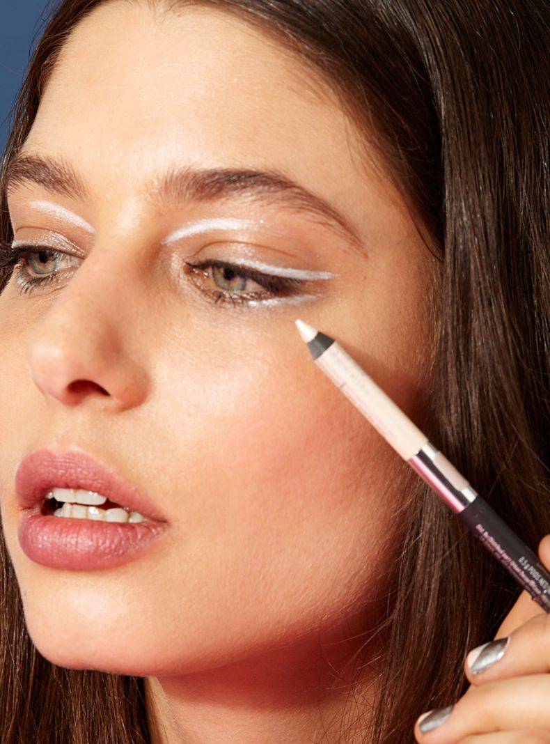 Короткими штрихами, как будто зарисовывая, пройдись карандашом (черным или любым темным) во внешнем уголке над подвижным веком. Во внутреннем уголке рисуй белым карандашом (или просто светлым), проведи и так же зарисуй область до середины глаз. Этим же карандашом на нижнем веке прокрась слизистую.