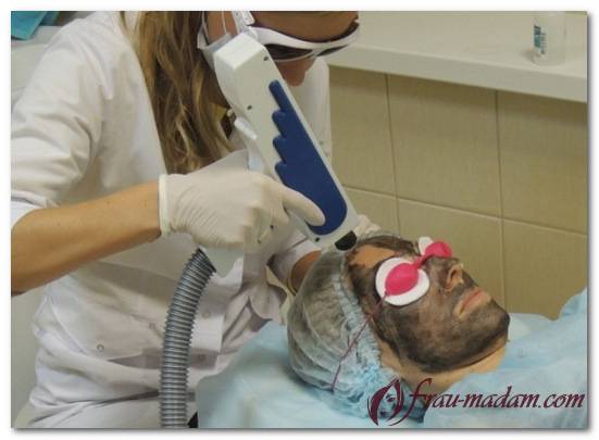 И теперь начинается собственно карбоновый лазерный пилинг. С помощью специального косметологического лазера косметолог подает на кожу кратковременные импульсы, которые нагревают частицы диоксида углерода.