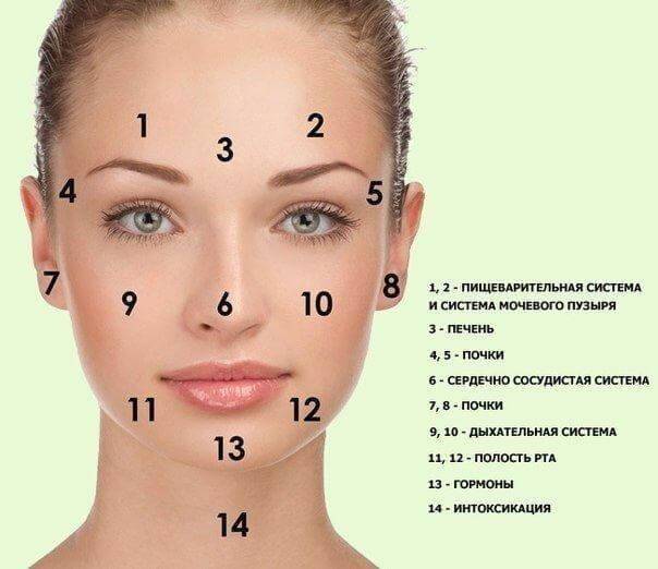 Условно лицо распределяется на несколько зон, и по ним можно составить карту прыщей на лице и что они означают: