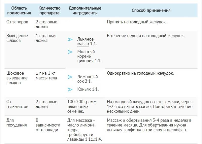 Как слабительное следует принимать по 15-30 г или по 15-30 капсул в течение получаса взрослым, а детям 5-15 г масла или 5-10 капсул.