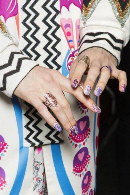 Все цвета лака на ногтях должны быть из одной гаммы. Принцип предельно прост: разноцветный маникюр, например, в оранжевых тонах предполагает, что каждый ноготок окрашен в свой оттенок оранжевого. Таким образом, создается оригинальный градиент.