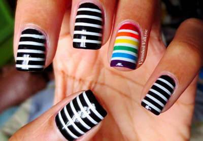 Очень эффектно смотрится, если накрасить ногти разными цветами радуги на обеих руках. Радужный эффект можно создать как за счет традиционного сочетания оттенков, так и сочетая всевозможные сочные цвета. Просто накрасьте каждый ноготок своим цветом и наслаждайтесь. Кстати, оттенки могут быть насыщенными или пастельными по желанию. Маленькая хитрость: яркий радужный маникюр будет выделяться лучше, если Вы наденете одежду приглушенных цветов, делая уклон исключительно на ногти.