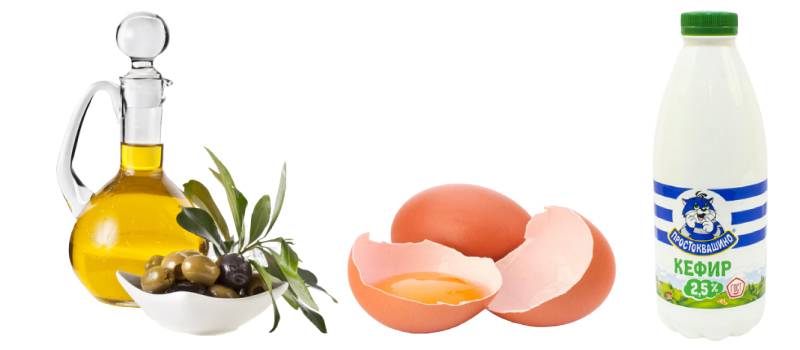 Следует смешать кефир и оливковое масло в пропорции 3:1, вбить в смесь яичный желток. Маску нанести на волосы, утеплить их и через час можно мыть голову.
