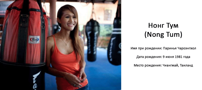Таиландская транссексуальная модель и актриса Нонг Тум рождена была в мужском теле в бедной семье и получила имя Паринья. Мальчик с самого детства любил одеваться в женские одежды, использовать косметику, за что над ним постоянного насмехались и били. После получения начального образования он начал профессионально заниматься кикбоксингом, чтобы помогать родителям, а также копить на операцию по смене пола.