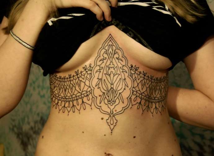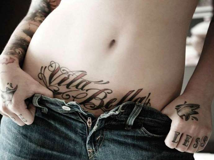 НаписаноТатуировка с надписью на животе девушки отражает внутренний мир ее обладателя, его ценности и жизненные приоритеты. Они часто пишут предложения на иностранном языке (например, английском, французском, латыни). Не менее востребованы санскритские иероглифы и молитвы, служащие одновременно оберегом.