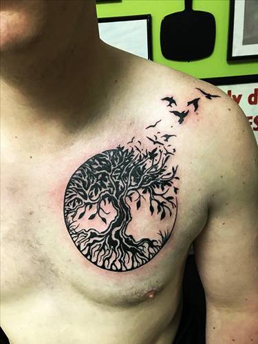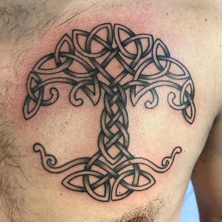 - Древо жизни. Олицетворяет возвращение умерших людей на землю в другом обличье. Это крупный рисунок, который наносится на верхнюю зону спины. Переплетающиеся ветки формируют круг, символизирующий солнце. Рисунок отождествлялся у кельтов с круговоротом.